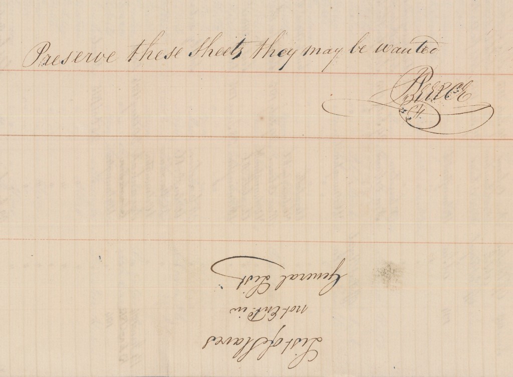 “Preserve these sheets they may be wanted,” signed by J Beerce, and then lower down on the page, and upside down, “List of Slaves not Entd in General List.”
